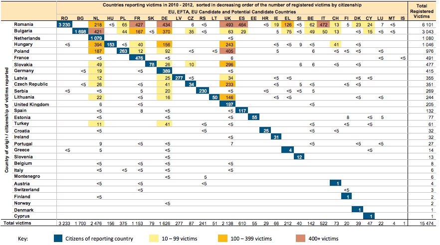 Per esempio: la Romania ha riconosciuto che 3.238 persone romene tra il 2010 e il 2012 sono state vittime del traffico. L’Olanda ha riconosciuto che, nello stesso periodo di tempo, 218 romeni (più probabilmente romene) sono state ridotte in stato di schiavitù dai trafficati e che altre 421 persone nella stessa situazione venivano dalla Bulgaria.