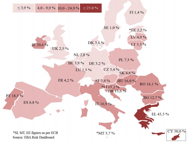 Ma il problema degli Npl (sofferenze bancarie) non riguarda solo la banca senese: tutto il sistema bancario italiano è “infettato” da crediti di difficile o impossibile recupero e il confronto internazionale è impietoso. Le banche di Grecia e Cipro hanno sono in testa alla classifica europea: hanno un livello di Npl superiore al 40% (Cipro addirittura al 50%). Seguono Irlanda e Portogallo e poi viene l’Italia con un rapporto tra crediti erogati e Npl pari al 16,9%.