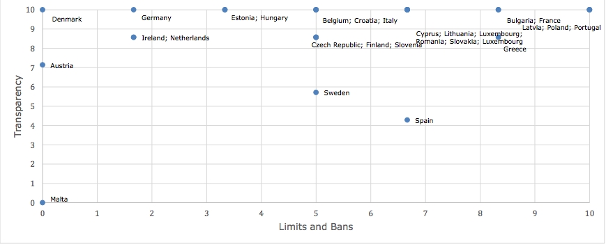Così si scopre, ad esempio, che a Malta c’è il minimo di trasparenza e il minimo di divieti mentre in Portogallo c’è il massimo di trasparenza e il massimo di divieti. L’Italia è a metà strada per quanto riguarda i divieti ma è anche uno di quesi Paesi dove vige il massimo di trasparenza, anche se i continui scandali che affollano le prime pagine dei giornali suggerirebbe altro. Eppure siamo nella stessa posizione di Belgio e Croazia mentre la Germania, ad esempio, ha lo stesso grado di trasparenza dell’Italia ma meno vincoli.