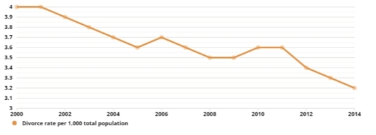 Per capire quanto rapido sia il calo dei divorzi basta pensare che nel 2010 erano stati 872mila e che nel 2000 arrivarono addirittura a quota 944mila con una percentuale sulla popolazione del 4%.