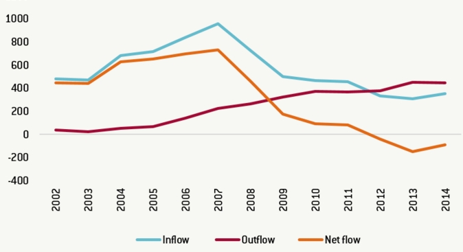 Nel grafico è indicata la quota, in migliaia di unità, di immigrati che sono arrivati in Spagna tra il 2002 e il 2014. Complessivamente la Spagna ha accolto, durante questo periodo, 7,3 milioni di persone e, contemporaneamente, ha visto lasciare il Paese 4,3 milioni di persone.