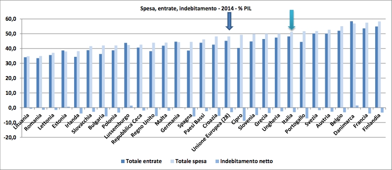 Se si va a vedere la graduatoria dei Paesi europei in base alla loro spesa, si scopre, infatti, che in tutte le 28 nazioni la spesa pubblica nel 2014, come si vede dal grafico sopra, ha ecceduto le entrate e, quindi che tutte hanno chiuso in deficit di bilancio tranne Danimarca, Lussemburgo ed Estonia.