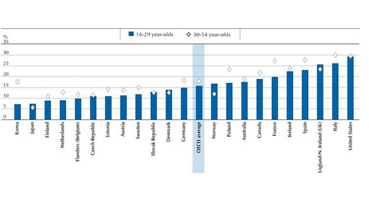 Individui, nelle fasce di età 16-29 e 30-54 anni, con scarse conoscenze matematiche in alcuni Paesi Ocse
