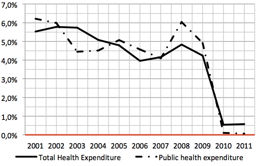 Fino al 2008 la crescita annua era intorno al 5% mentre nel 2010 e nel 2011 la crescita reale media è stata nulla mentre dal 2009 si assiste ad un vero crollo. Significa che i Paesi Ocse non hanno più aumentato la spesa sanitaria tanto che nel 2010 e nel 2011 la crescita è stata zero.