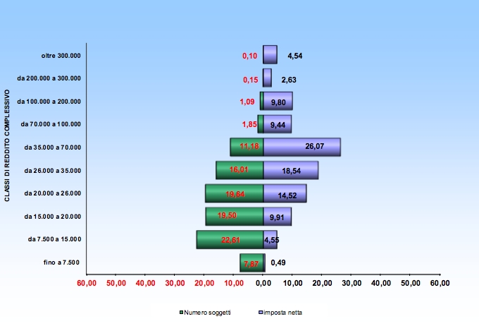 Nel 2014 (redditi 2013) risulta che lo 0,1% delle persone più ricche, cioè quelle che hanno dichiarato un reddito superiore ai 300mila euro l’anno, hanno pagato il 4,54% dell’Irpef complessiva versata da tutti gli italiani. In termini di valori assoluti significa che 31.020 persone hanno pagato 7,618 miliardi di euro con una media di 245,587 milioni di euro a testa.