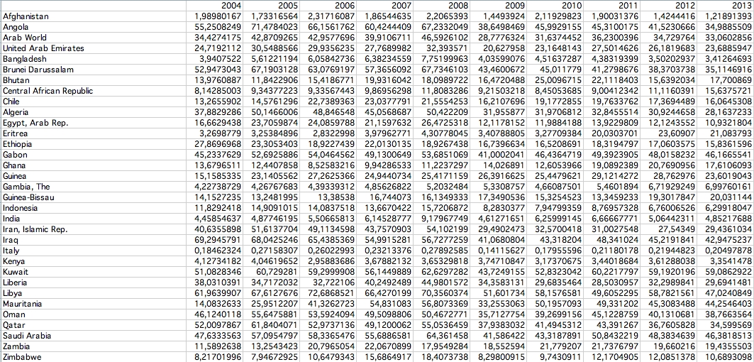 La tabella sopra mostra l’andamento del peso delle concessioni per lo sfruttamento del gas naturale, delle foreste e delle miniere sul Prodotto Interno Lordo di alcuni Paesi del mondo tra il 2004 e il 2013. Questi numeri smentiscono un luogo comune piuttosto diffuso e, cioè, che sono soprattutto i Paesi poveri ad essere dipendenti dallo sfruttamento delle proprie risorse naturali da parte di società perlopiù straniere. E’ vero il contrario: sono soprattutto i Paesi arabi ricchi che fanno dipendere anche oltre il 50% del proprio Pil dalle concessioni.