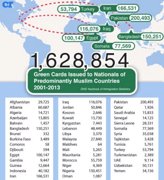 Probabilmente è un progetto di difficile realizzazione, ma stando ai numeri occorre riconoscere che la maggior parte delle green card (un documento che permette ai non nativi di risiedere negli Usa a tempo illimitato) rilasciate dagli Stati Uniti dall’11 settembre 2001 al 2013 sono andate a cittadini che provengono prevalentemente da Paesi dove la religione musulmana è quella maggiormente professata.
