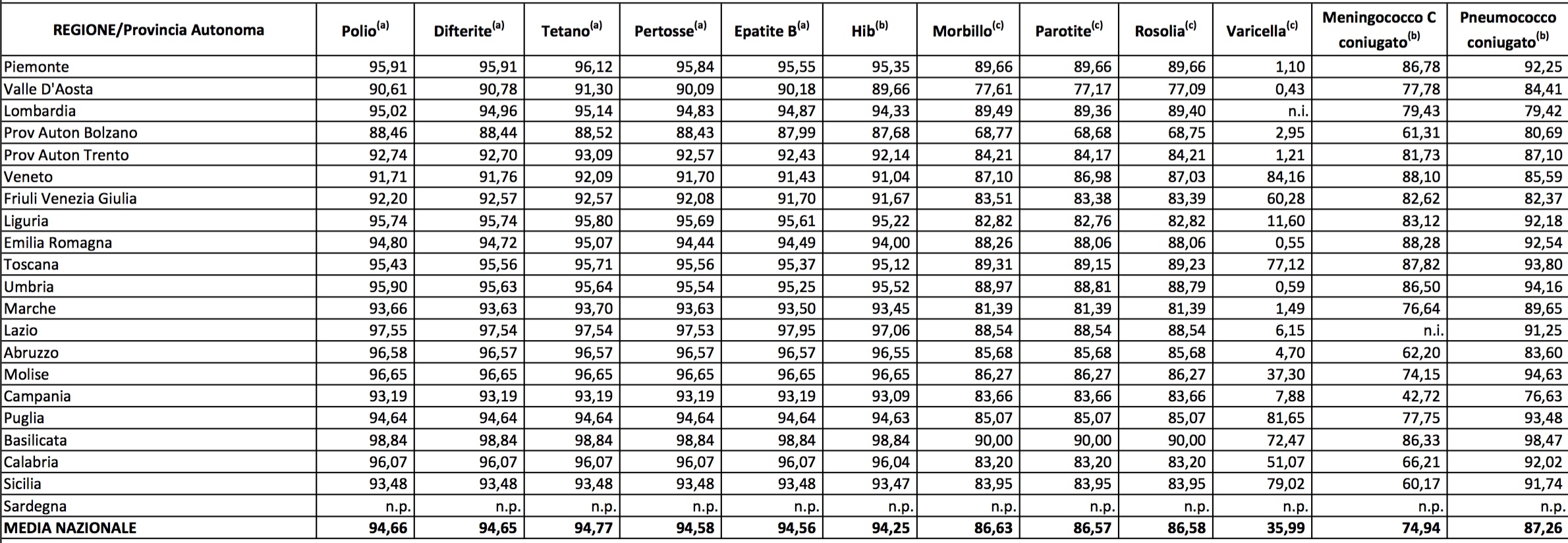Per la difterite la media nazionale è del 94,65%, il Tetano al 94,77%, la Pertosse al 94,58%, l’Epatite B al 94,56%, il Morbillo all’86,63%, la Parotite all’85,57%, la Rosolia all’86,58%, la Varicella al 35,99%, il Meningococco C al 74,94% e il Pneumococco all’87,26%.