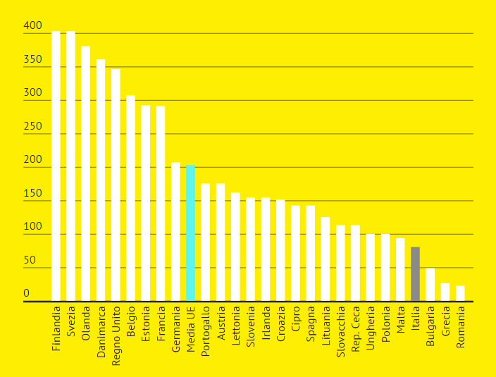 Come si vede, l’Italia è quasi in fondo alla classifica europea. Da noi, gli strumenti di pagamento diversi dal contante vengono usati in media 79,9 volte all’anno, cioè meno di due volte alla settimana. Al contrario, in Svezia e Finlandia le persone pagano con il bancomat o la carta di credito 402,2 volte all’anno, cioè più di una volta al giorno. In Europa, la media è di 202,3 pagamenti all’anno, quindi… Continua…